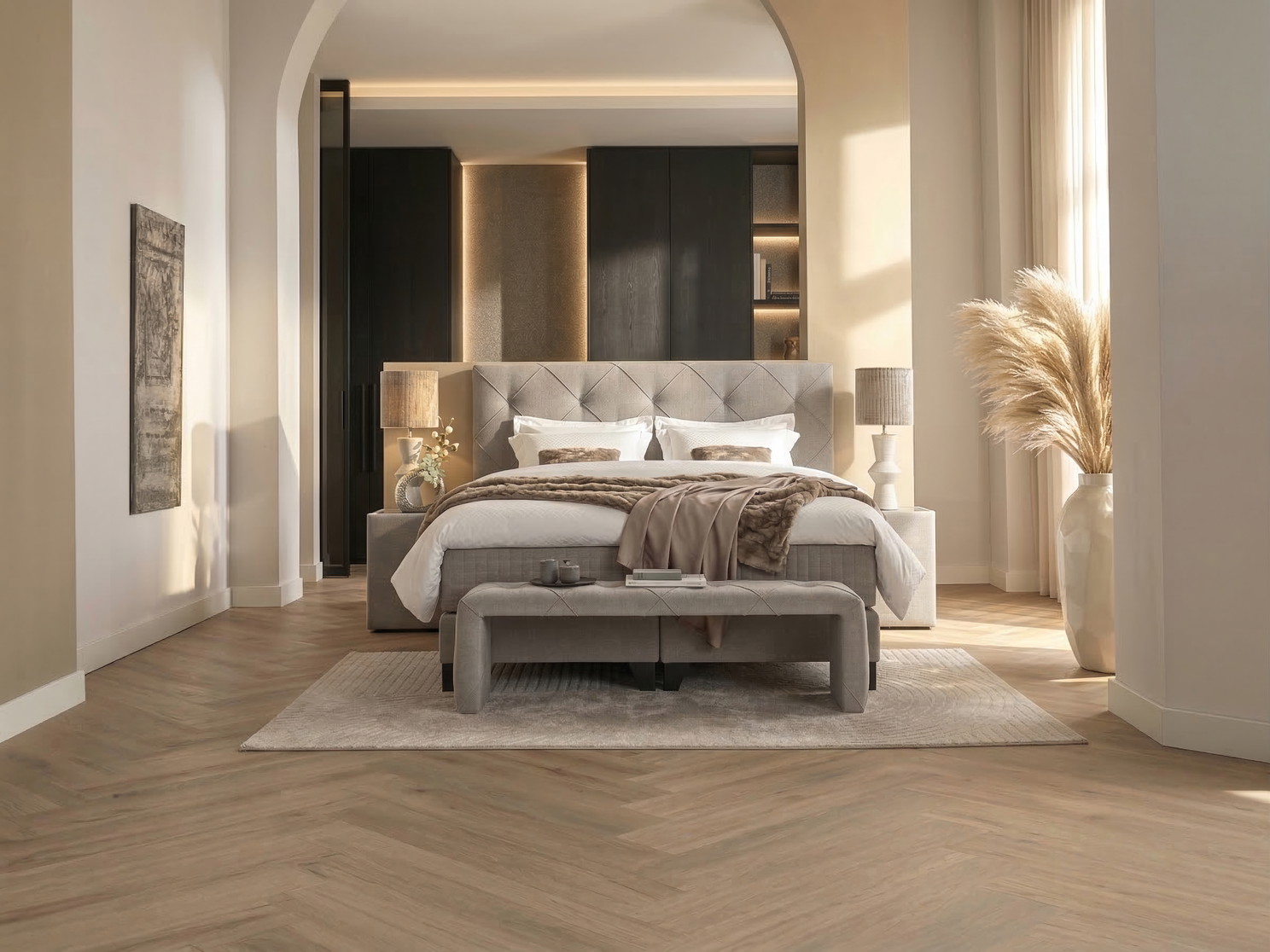 Met verfijnde capitonnering en subtiele diagonale biezen in een elegant ruitpatroon combineert dit hoofdbord klassiek vakmanschap met een moderne uitstraling.