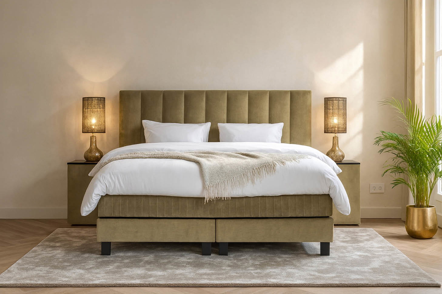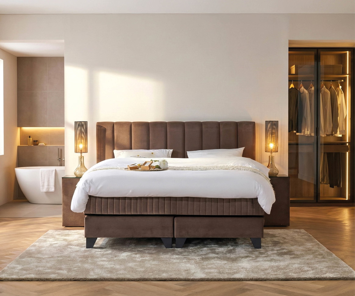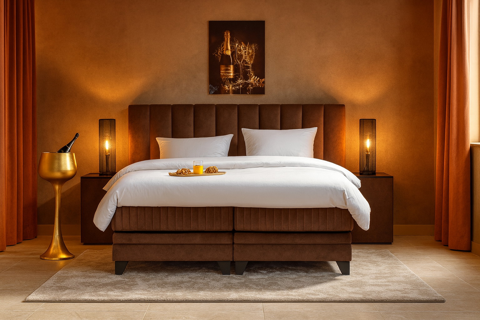 Het Hotelbed van het jaar is speciaal samengesteld en bevat extra upgrades: luxe stoffering in Boston Cement, het Royalty-matras en een verkoelende Gelfoam-topmatras. Deze set samengesteld op basis van inzichten uit de wereld van luxe hotellerie. Afgestemd op wat hotelgasten écht waarderen. Bekijk de pagina van dit model voor alle details: serta.nl/boxsprings/premium-series/hotelbed-van-het-jaar-magnifique