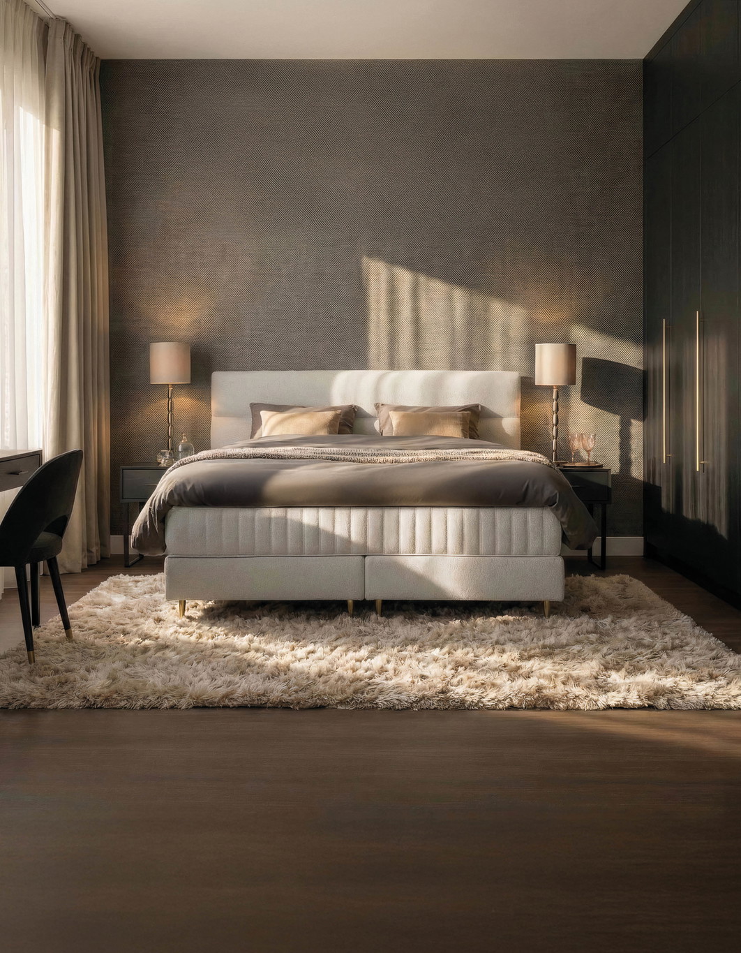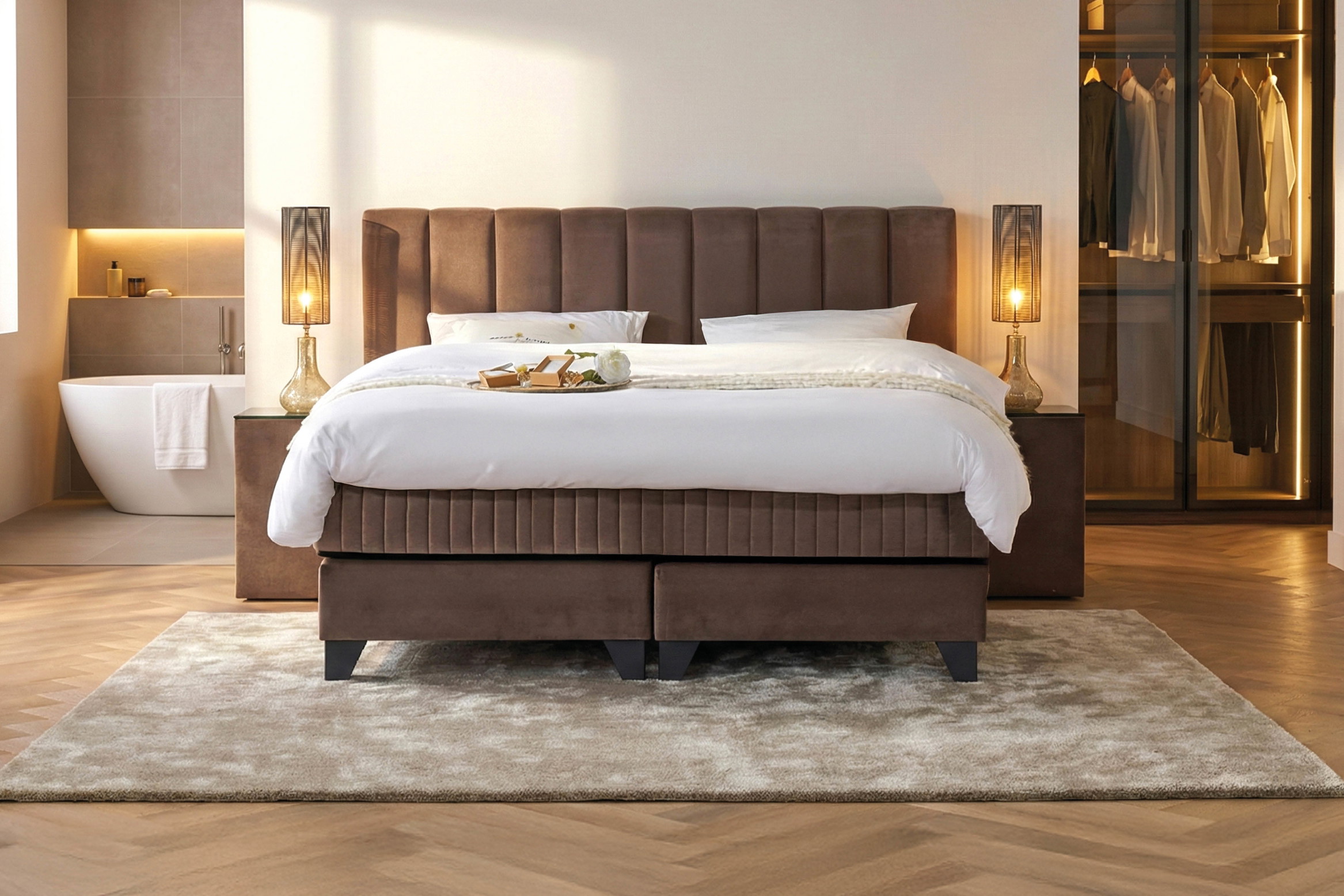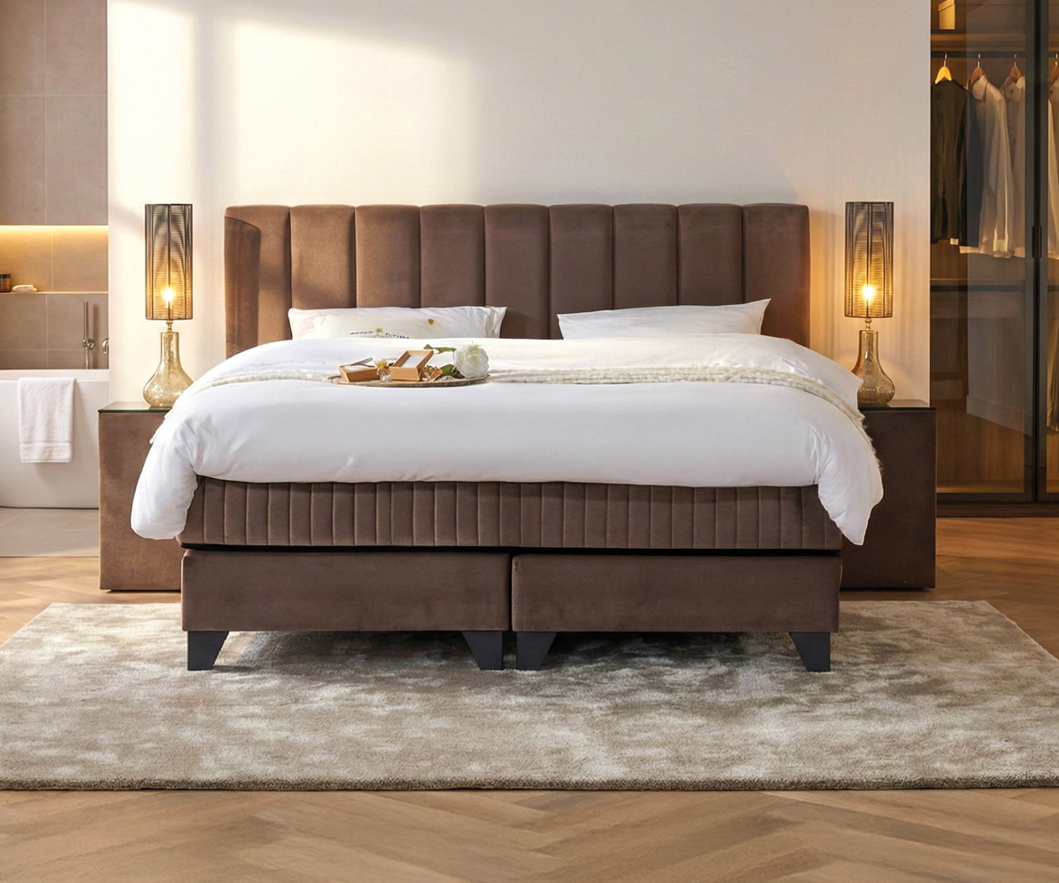 Het Hotelbed van het jaar is speciaal samengesteld en bevat extra upgrades: luxe stoffering in Boston Cement, het Royalty-matras en een verkoelende Gelfoam-topmatras. Deze set samengesteld op basis van inzichten uit de wereld van luxe hotellerie. Afgestemd op wat hotelgasten écht waarderen. Bekijk de pagina van dit model voor alle details: serta.nl/boxsprings/premium-series/hotelbed-van-het-jaar-magnifique